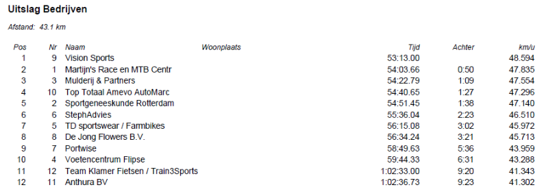 Vol goede moed en met gezonde spanning stonden we op het startblok. 5… 4… 3… 2… 1… START! We knallen uit de startblokken en daar ging het direct mis. Door de impact van de rol van het startblok schiet het wiel van Roel wat los en loopt aan. Hij probeert het nog even te herstellen, maar al fietsend ging het niet lukken. Dus besluiten we te stoppen om het wiel goed te zetten. Het is niet anders. Ondertussen worden we alvast ingehaald door het team dat na ons mocht starten. We vertrekken weer verder en omdat onze motor niet meer voor ons reed was het parcours onduidelijk en gingen we rechtdoor bij een brug ipv rechtsaf het fietspad op, juist… Beetje jammer en weer tijd verloren. Goed klassement zit er niet meer in, maar we kunnen natuurlijk nog wel proberen lekker te rijden en met een goed gevoel afsluiten. Dus GAS erop! Na een kilometer of 5 tot 7 draaien we een viaduct op en dat was het moment dat Roel helaas zijn max had bereikt. Geen goede start en onvoldoende goede benen, dus helaas. We hebben geschakeld door Roel uit de wind te houden, maar het was niet mogelijk om nog harder te gaan. Daarna waren het lange kilometers voor Roel, maar we hebben het als team uitgereden en gezamenlijk de finish gepasseerd.