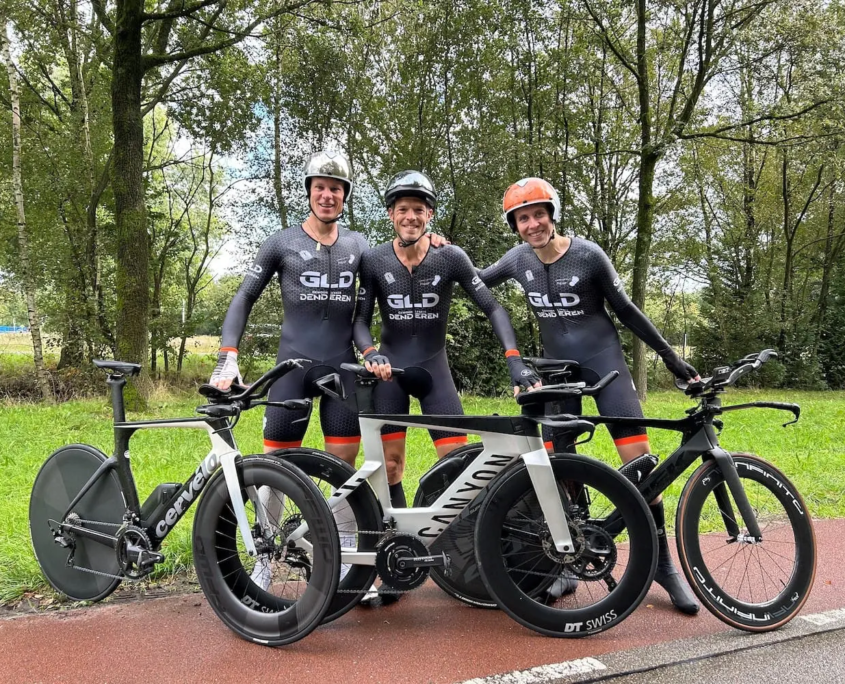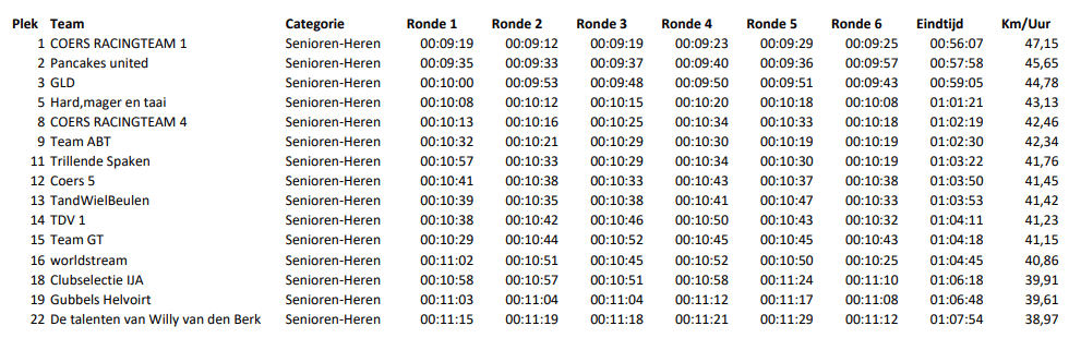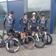 Vught is een ploegentijdrit waarbij er 4 mogen starten en de 3e tijd geldt als eindtijd. Door een afmelding van Roel zaten we met 5 renners en 4 plaatsen. Dus we hebben besloten om 2 teams in te schrijven en te zoeken naar aanvulling. Die aanvulling is gevonden in Vincent en wat voor een machine is dat zeg! Het parcours is vrij eenvoudig. Er wordt over een afgesloten weg in een lus gereden van ongeveer 7 kilometer en dan een totaal van 6 ronden. Er waren verschillende series met elk 8 teams die om de minuut starten. Dus je komt constant andere teams tegen om in te halen. Onder de naam Pancakes united reden Coen, Carsten en Vincent naar de 2 eindtijd. In de laatste bocht ging Carsten nog onderuit, maar kon gelukkig vrij snel opstarten en doorrijden. Toch kost dat al snel 20 tot 30 seconden, dus dat heeft het gemiddelde wel gedrukt. Duco, Michiel en Jelle reden de 3e tijd, dus het podium was goed bezet! Hun wedstrijd verliep aardig, maar door ziekte van Jelle kon hij minder bijdragen aan het team en dan is 42 kilometer opeens erg lang. Desalniettemin een mooi evenement en goed om dit volgend jaar te verbeteren!